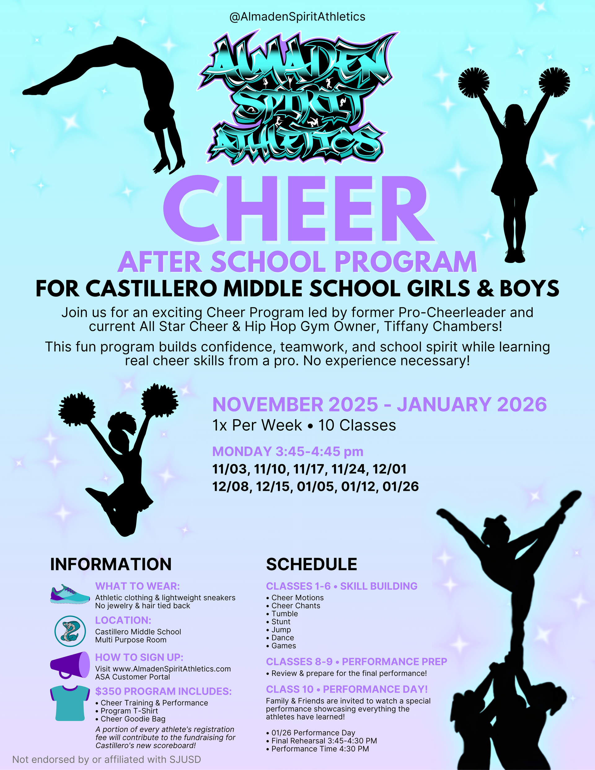 This fun program builds confidence, teamwork, and school spirit while learning real cheer skills from a pro. No experience necessary!
