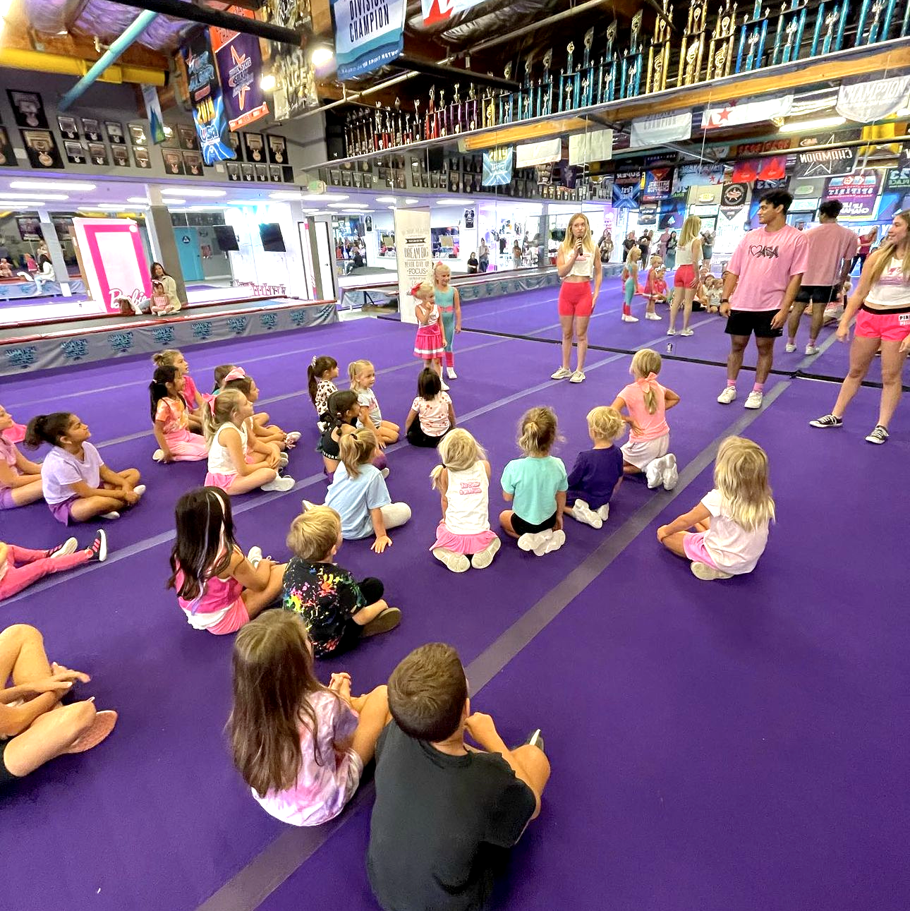Parties typically begin with open gym free play, followed by fun, interactive games. From there, kids can enjoy cheer or dance activities of their choice: stunting, tumbling, learning a routine, and more!