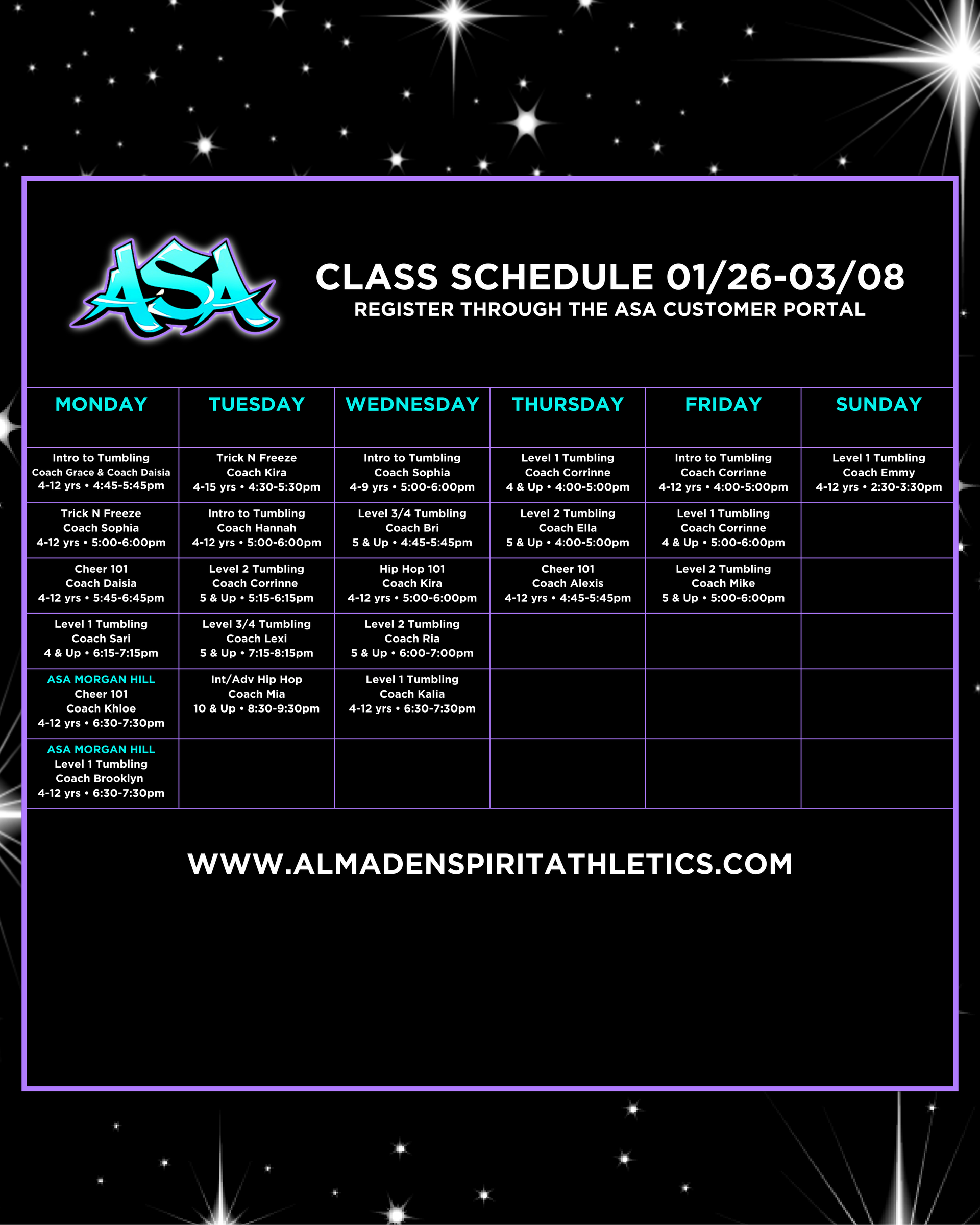 Athletes will stunt & tumble every week for the majority of class and will also rotate between working on dance, jumps, conditioning & motion technique each week. This class is great preparation for any kind of school cheerleading and for our own All Star Cheer programs.